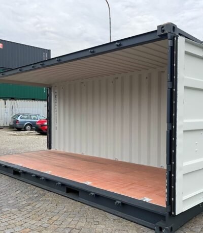 Offener Seitencontainer 20′ in IICL6-Qualität, einmalig verwendet, Farbe RAL 7016. Wenn Sie nach einer idealen Lösung für den Transport von sperrigen Materialien suchen, die sich nur schwer durch herkömmliche Türen laden lassen, ist unser offener Seitencontainer 20′ die richtige Wahl. Dieser Container in ausgezeichneter IICL6-Qualität und einmalig verwendet ist verfügbar. Dank der seitlich zu öffnenden Wand erleichtert er die Handhabung der Güter und sorgt für Effizienz und Komfort beim Transport. Unsere Container werden in unserem Lager aufbewahrt und stehen zur Abholung bereit. Der Preis des Containers beinhaltet die Versand- und Lagerkosten.